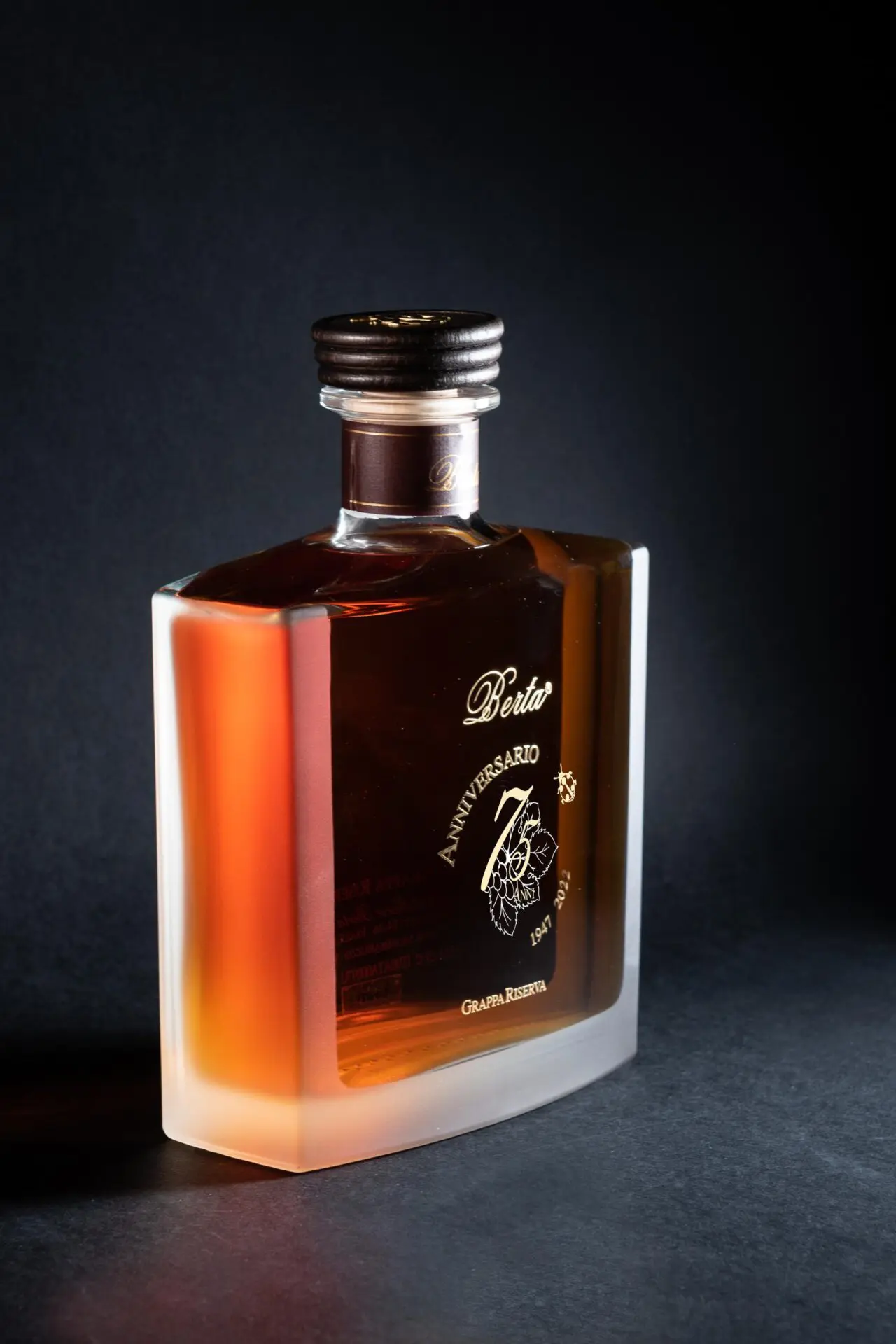 La Riserva 75 anni dal colore ambrato, è infatti ottenuta dall’assemblaggio di dieci diverse annate di Selezione del Fondatore, l’etichetta più preziosa delle Distillerie Berta, una grappa di barbera e nebbiolo invecchiata; il profumo è quindi complesso, ampio avvolgente, con grande personalità. Uno splendido concerto di sensazioni nelle quali spicca la frutta matura, la ciliegia, il tabacco, il cacao, la vaniglia.