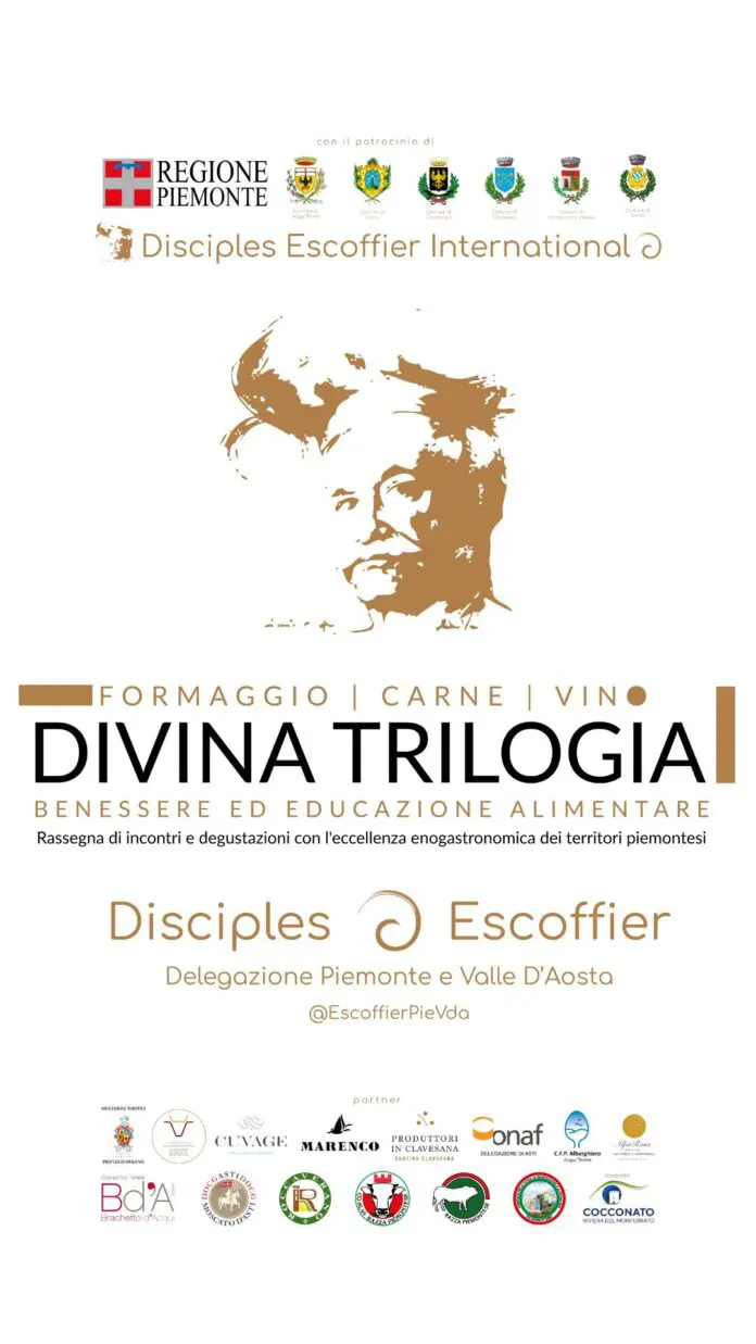 “Con questa Divina Trilogia vogliamo inaugurare una nuova vera ripartenza, ricca di collaborazioni e di obiettivi” dichiara il Presidente Escoffier – Piemonte e Valle D’Aosta Claudio Barisone “l’Associazione si è arricchita di importanti competenze e vuole espandere la propria attività divulgativa nel pieno spirito del maestro Escoffier. Unitamente ai Comuni e al supporto messo in campo dall’Assessorato al Cibo e all’Agricoltura della Regione Piemonte stiamo promuovendo diverse iniziative volte ad approfondire e promuovere le qualità delle materie prime per una migliore cucina ed un salutare stile di vita.”