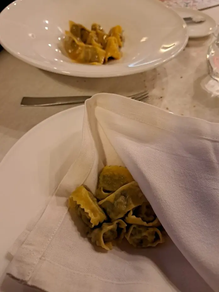 Poi, l’attesissimo momento degli agnolotti, il piatto simbolo del ristorante e un tributo alla memoria di Lidia Alciati, la mamma di Piero e Ugo. Gli agnolotti, preparati con cura e passione, erano avvolti dal loro leggendario sugo d’arrosto che ci ha lasciati senza parole. Abbiamo anche assaggiato i plin al tovagliolo, una variante di agnolotti più piccoli, dalla ricetta della nonna.