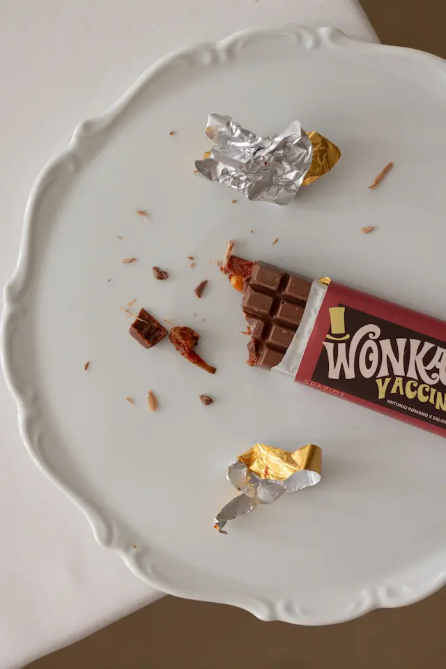 “Wonka’s Vaccinara è un’idea nata dalla bella sinergia creata con l’ideatrice di Salone OFF Food Topic, Rosalia Imperato”, continua Antonio Romano. “In una sorta di brainstorming disquisendo sulla cinematografia di Tim Burton che è il tema della prossima edizione di Salone OFF abbiamo avuto l’intuizione di riempire una tavoletta di cioccolato con uno dei piatti tipici della cucina romana: la coda alla vaccinara. La ricetta tradizionale di questo piatto prevede l’aggiunta in preparazione di cacao amaro o cioccolato fondente. Abbiamo dunque cambiato l’ordine degli addendi e il risultato è una barretta di cioccolato stravagante, bizzarra, stramba proprio come le atmosfere e i personaggi di Tim Burton.”
