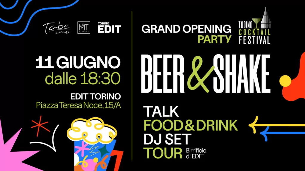 Il Torino Cocktail Festival partirà il 10 giugno con un opening party dedicato agli addetti ai lavori e un’esperienza presso Casa Martini. La vera festa di inaugurazione per il pubblico sarà Martedì 11 giugno presso EDIT Torino: “Beer and Shake”. La Birra Edit sarà protagonista come ingrediente per la miscelazione e per le degustazioni. Ci sarà la possibilità di fare un percorso di visita all’interno del birrificio Edit, con proposte food, dj set e molto altro!