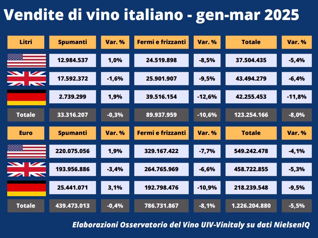 Export vino italiano: -9% extra-UE nel primo trimestre 2025, allarme UIV